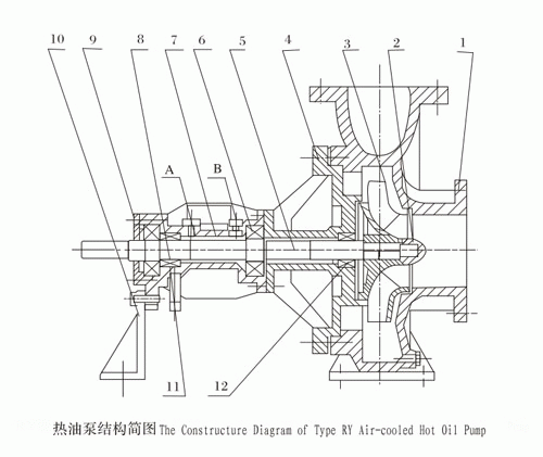 1、泵體 2、葉輪螺母 3、葉輪 4、泵蓋 5、泵軸 6、軸承 7、軸承體 8、導(dǎo)油管 9、軸承壓蓋 10、支架 11、油封 12、填料