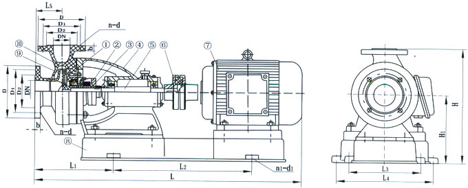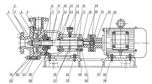 6、如果更換滾珠軸承或泵軸時,必須拆下機架,松開前端軸承蓋4只螺釘。拆下泵軸后端 螺母和聯(lián)軸器,將泵軸向前端方向打出即可,再后拆下后端軸封蓋。