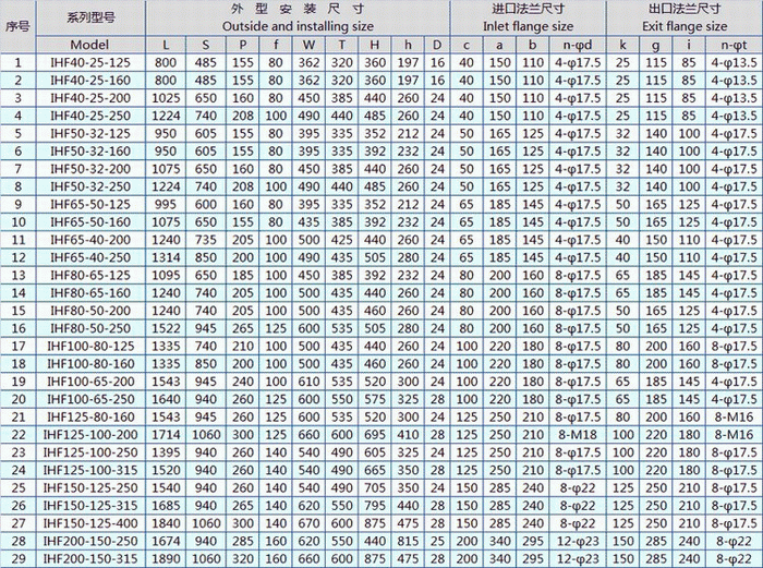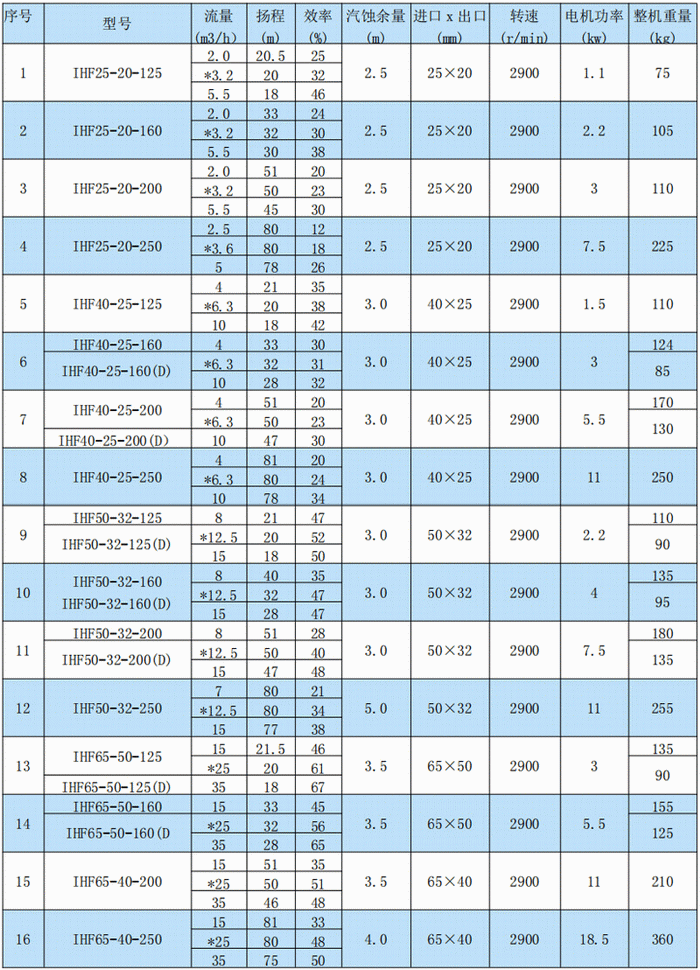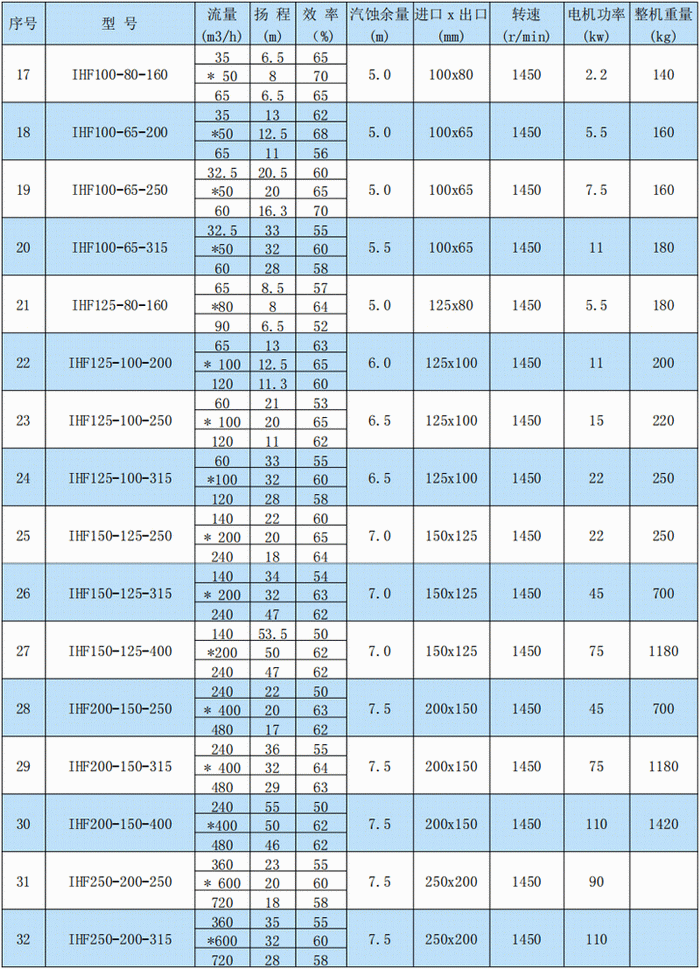IHF型臥式化工離心泵性能參數(shù)表: