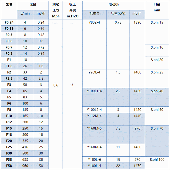 F型不銹鋼齒輪泵性能參數(shù)表:
