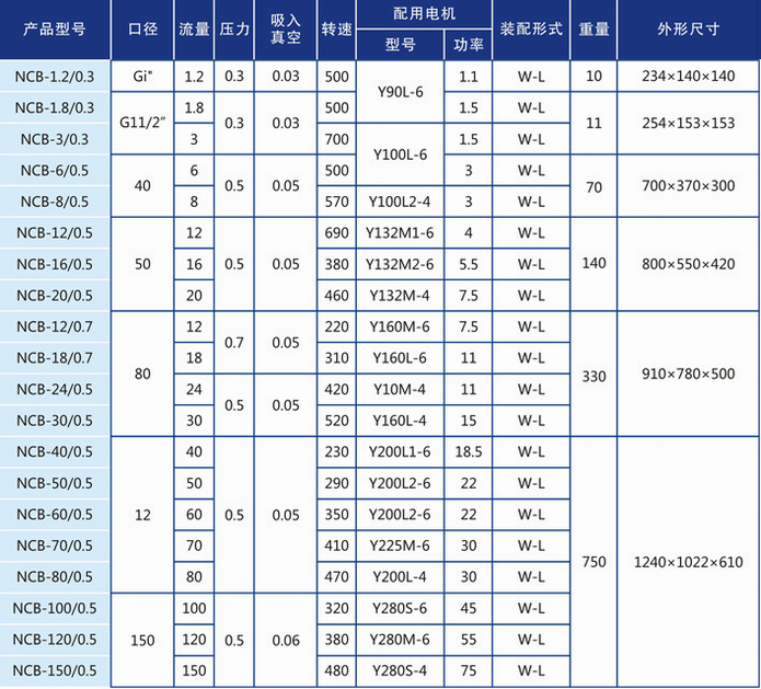 NCB內(nèi)嚙合轉(zhuǎn)子泵性能參數(shù)表: