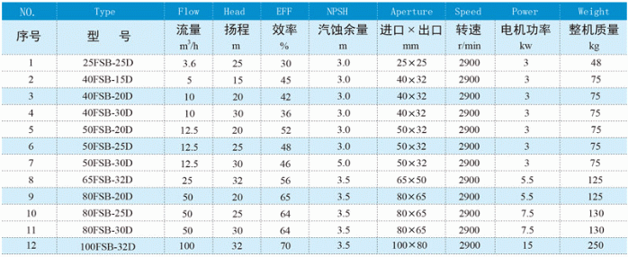 FSB-D型氟塑料合金離心泵性能參數(shù)表: