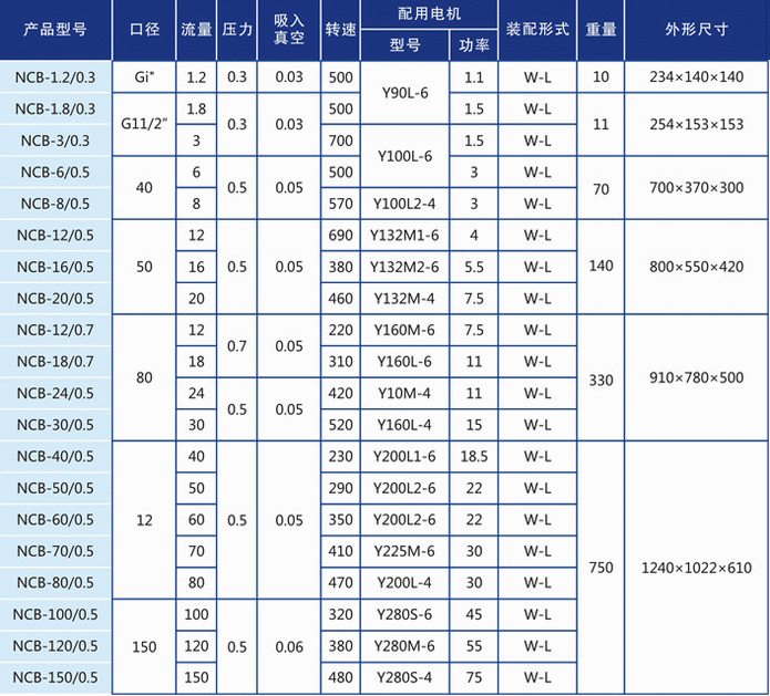 NCB不銹鋼轉(zhuǎn)子泵性能參數(shù)表: