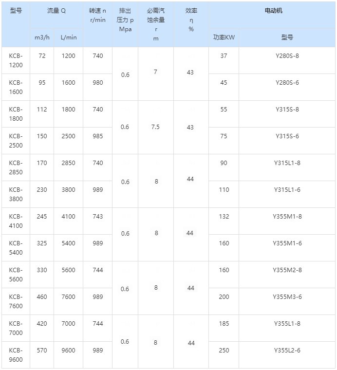 KCB大流量齒輪泵性能參數表: