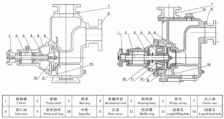 3、在一些泵的軸承體底部還設(shè)有冷卻室。當軸承發(fā)熱引起軸承體溫升超過70℃時,可在冷卻室處通過任意一只冷卻液管接頭注入冷卻液循環(huán)冷卻。泵內(nèi)部防止液體由高壓區(qū)向低壓區(qū)泄漏的密封機構(gòu)是前后密封環(huán),前密封環(huán)裝在泵體上,后密封環(huán)裝在軸承體上,當泵經(jīng)長期運轉(zhuǎn)密封環(huán)磨損到一定程度,并影響到泵的效率和自吸性能時,應(yīng)給予更換。