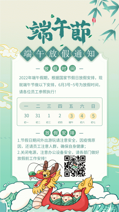根據(jù)《國務(wù)院辦公廳關(guān)于2022年部分節(jié)假日安排的通知》精神,2022年端午節(jié)放假具體安排為:6月3日(星期五)至6月5日(星期日)放假,共3天。節(jié)假日期間,各部門要妥善安排好值班和安全、保衛(wèi)等工作,遇有突發(fā)事件發(fā)生,要按規(guī)定及時報告并妥善處置。放假期間請各位員工出行注意安全,做好安全防范措施。 祝大家端午節(jié)快樂!